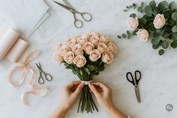 Секрет хорошей цветочной композиции — внимание к деталям. Современные букеты часто упаковываются в крафт-бумагу, фетр, кальку, или оформляются в шляпные коробки, корзины, стеклянные вазы. Это важно не меньше самих цветов: хорошая упаковка задаёт тон. Она может быть стильной, лаконичной, праздничной или символичной — подберите её под ситуацию.