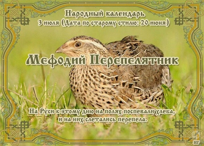 В народе этот день получил название Мефодия Перепелятника. Июль — время, когда на полях начинает наливаться хлеб, а перепела слетаются в поисках зерна. Именно тогда охотники выходили на легкую добычу — птиц можно было ловить без особого труда, и никто не оставался без трофея. Так за святым закрепилось прозвище «перепелятник».