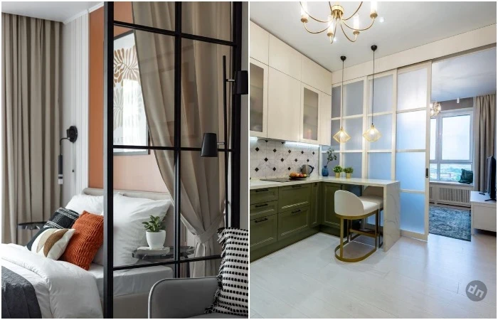Самое время перейти к тяжелой артиллерии. Речь идет о полноценных перегородках. Вместо того, чтобы устанавливать глухие «стены» из гипсокартона, которые не будут пропускать свет и визуально уменьшат пространство, отдавайте предпочтение изделиям из стекла. Они никак не препятствуют солнечным лучам, но при этом создают четкую физическую границу.