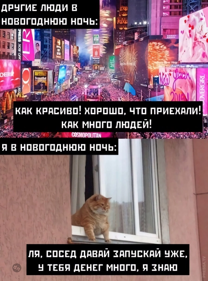 Новогодняя ночь и ожидание полуночи — еще один популярный источник для юмористических мемов. Они могут шутить о том, как сложно дождаться полуночи, особенно если вечеринка началась слишком рано, или о смешных ситуациях, происходящих в момент наступления Нового года. Например, мем может показывать кота, который уснул в кресле за пять минут до полуночи, с подписью: «Я готов встретить Новый год!»