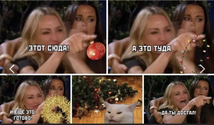 Среди наиболее популярных мемов этого года — изображения с известными героями кинематографа и анимации, которые оказались в неожиданных для себя новогодних ситуациях. Например, мем с изображением персонажа, который устанавливает ёлку на потолке, или рождественский вариант классического мема с котом и дамой за столом, где кот уверенно заявляет, что он знает, кто украл новогодний ужин.