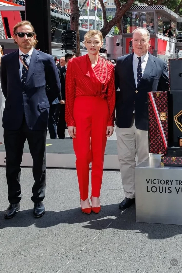 47-летняя княгиня Шарлен вышла в свет в красном костюме и украшениях Louis Vuitton, дополнив образ туфлями Manolo Blahnik в тон. Вечером того же дня она появилась на гала-ужине в белом платье в пол, а 67-летний Альбер надел смокинг с бабочкой.