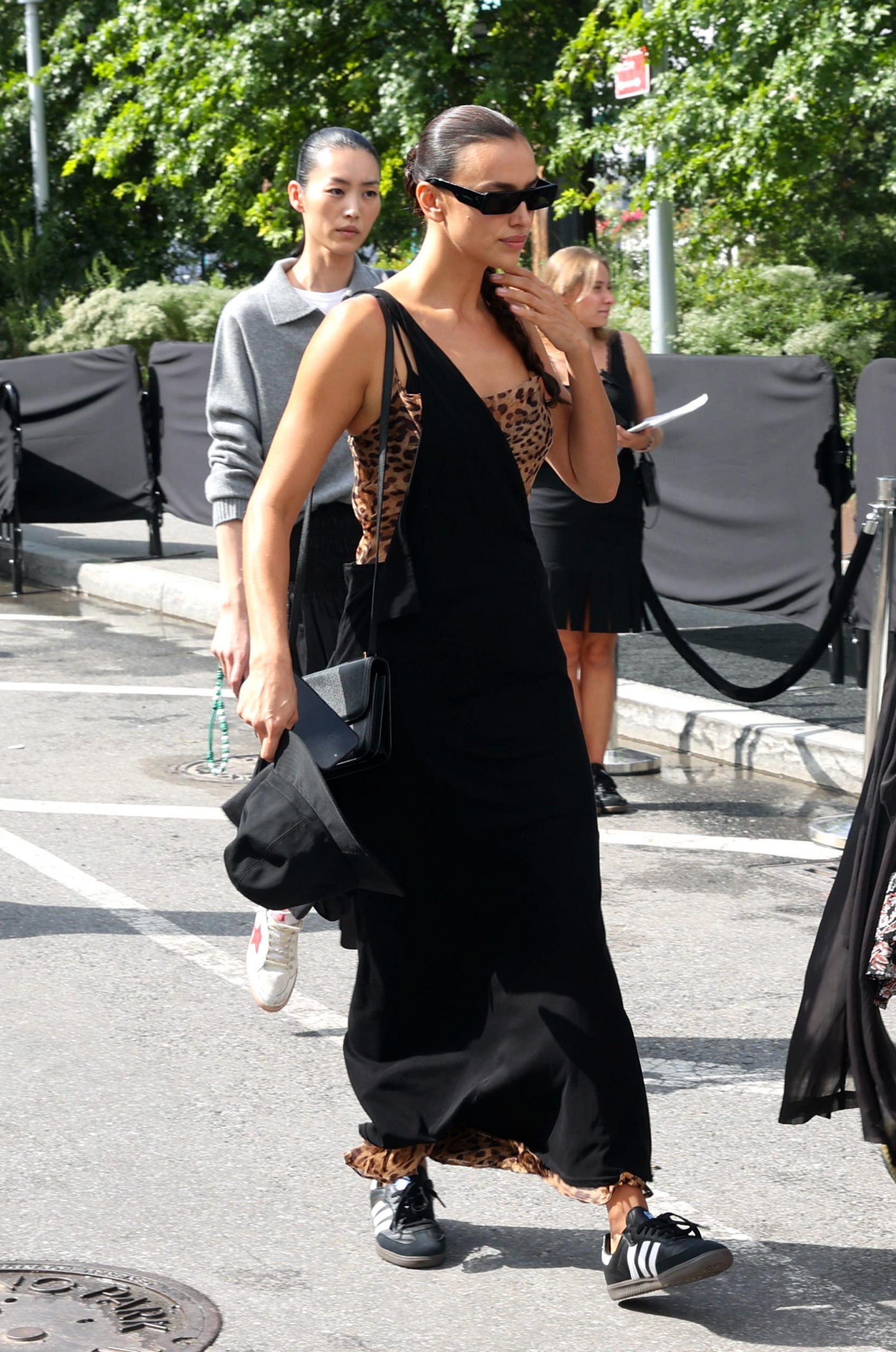 Российская супермодель Ирина Шейк демонстрирует, как спортивная обувь может быть стильной составляющей повседневного образа. В одном из своих выходов она была замечена в легком платье с леопардовым принтом, черных кедах Adidas, классической сумке и шляпе. Ее образ дополняли солнечные очки и собранные в тугой хвост волосы. В другой раз Шейк надела белоснежное приталенное платье и грубые черные кроссовки Nike с белыми спортивными носками, показывая, что контрастные сочетания могут выглядеть эффектно.