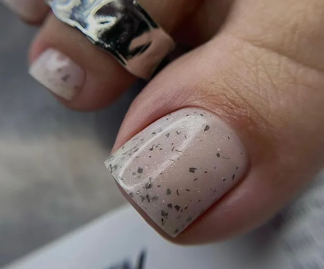 Для любительниц вечерних вечеринок подойдет темно-серый лак с металлическим отливом. Этот дизайн придает ногам изысканное сияние и прекрасно сочетается с разнообразием обуви от босоножек до сандалий.