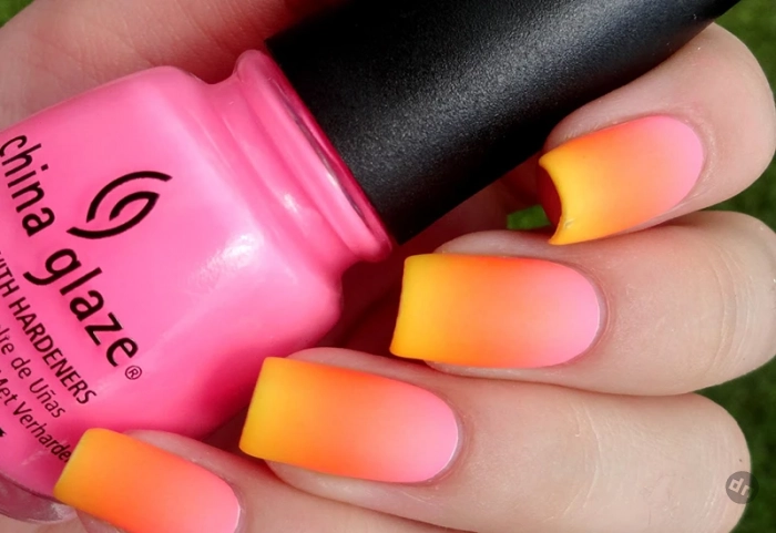 Для тех, кто любит сдержанный маникюр, но хочет внести немного яркости, градиент — идеальный выбор. Переход от натурального розового к персиковому или яркому оранжевому создаст эффект легкости и свежести. Мастера салонов создадут этот эффект с помощью аэрографа, а дома вы можете использовать губку для посуды. Нанесите основной цвет, дайте ему высохнуть, затем прокрасьте губку вторым оттенком и аккуратно перенесите его на ногти.