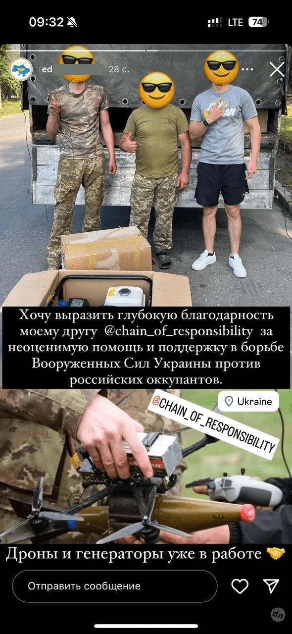 Подтверждением того, что средства Alpha DEX действительно направляются на поддержку украинской армии, служат скриншоты с благодарностями от украинских фондов. Один из фондов публично выразил благодарность Рустаму Мамедову за помощь в поставках дронов и генераторов для ВСУ, что еще раз подчеркивает политический и этический аспект участия в проекте.