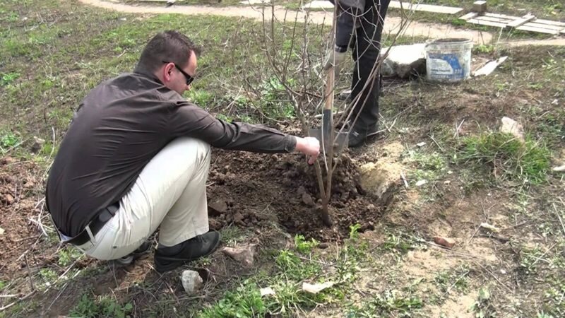 Затем установите саженец в яму, выпрямите его корни и засыпьте землей.