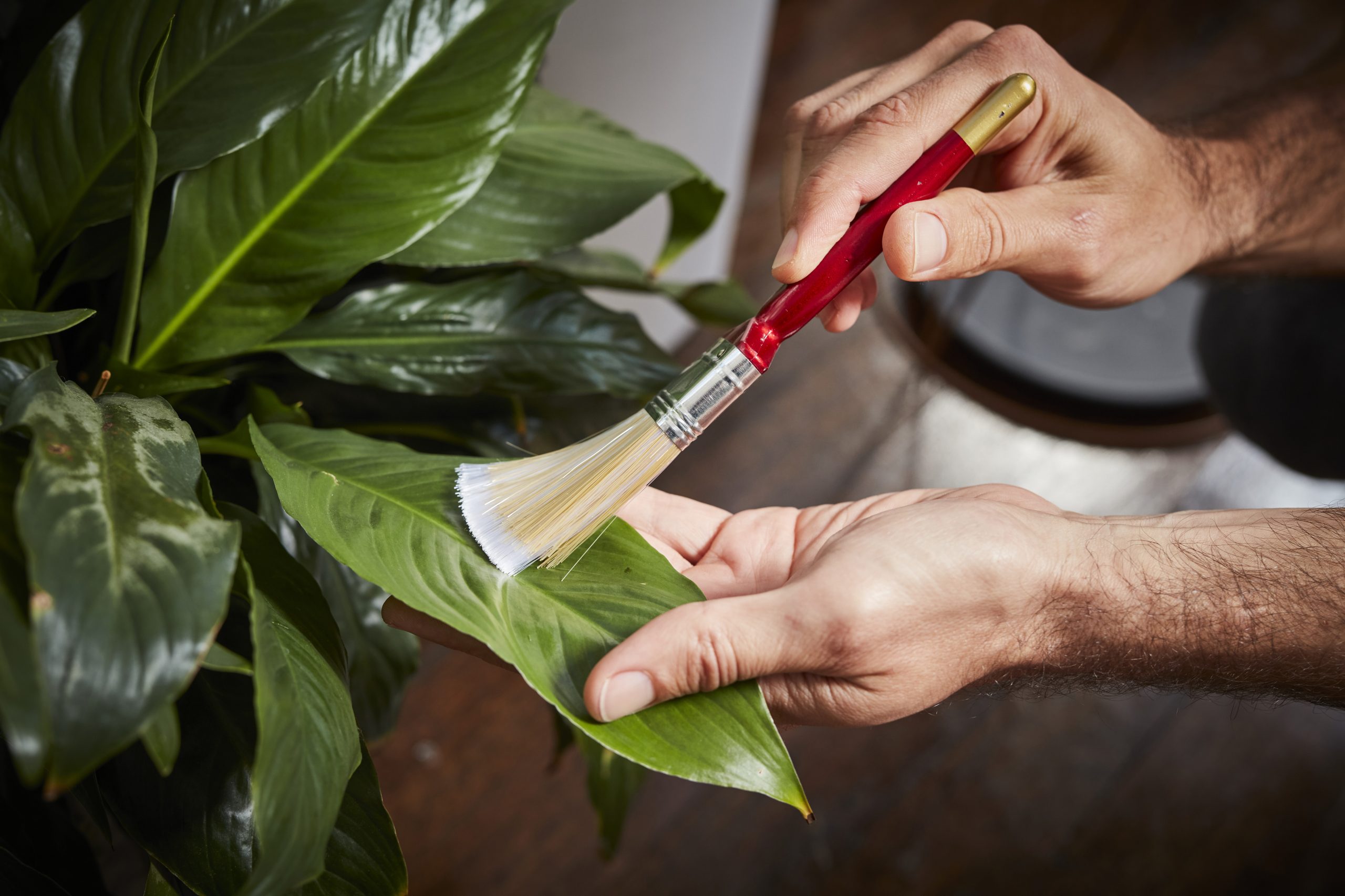 Используйте сжатый воздух или мягкую кисточку, чтобы осторожно убрать пыль с волосков листьев.
