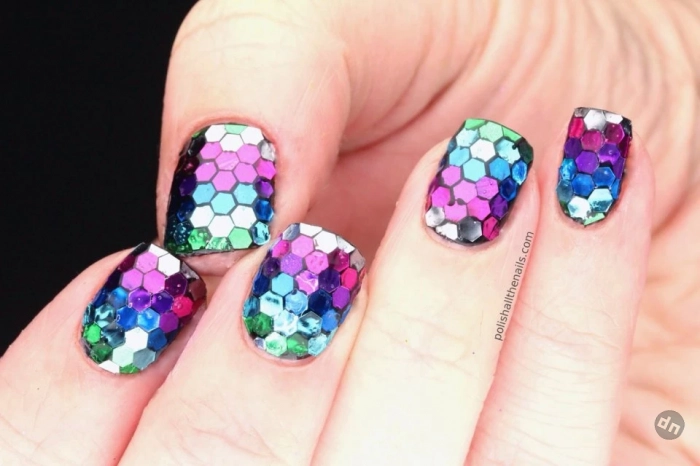 Если вы планируете наряд в стиле диско или платье с пайетками, маникюр может стать ярким продолжением образа. Покройте ногти золотыми, серебряными или цветными пайетками, чтобы дополнить праздничный образ.
