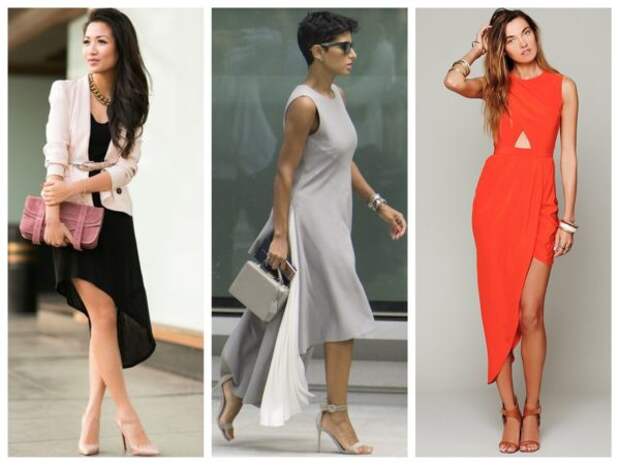 Платья с асимметричным кроем часто выглядят выигрышно на женщинах любого роста. Главное, чтобы минимальная длина подола приоткрывала колено. Это сделает образ элегантным и уместным как для прогулки, так и для вечеринки.