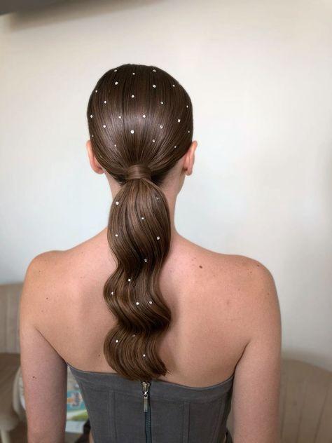 Стразы — неизменный атрибут моды 2000-х. Они идеально подойдут как для распущенных волос, так и для собранных причесок, где можно использовать кристаллы на леске или самоклеющиеся варианты.