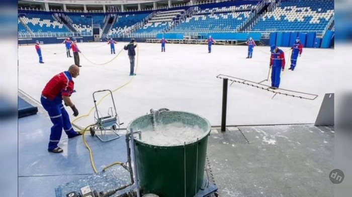 Как только лед становится достаточно толстым, наступает этап покраски. Для тренировок чаще всего используется серый лед, поэтому сначала на поверхность наносят белую краску, а затем серую. После этого начинается отжиг — процесс, при котором специальная машина прессует поверхность льда, устраняя лишний воздух и соли, которые могут мешать качеству покрытия. В завершение заливается последний слой льда, что делает его идеальным для дальнейшего использования.