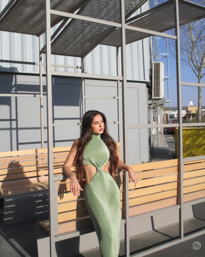 Недавно артистка также поделилась фотографиями в зеленом облегающем платье с вырезами на талии, дополненном золотыми украшениями.